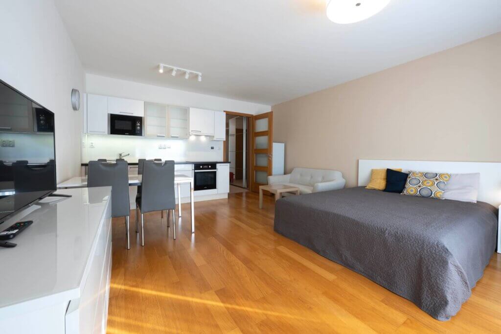 Tento světlý a útulný byt má plně vybavený kuchyňský kout (lednice, mrazák, myčka, trouba, varná deska, mikrovlnná trouba, digestoř) , jídelní stůl se židlemi, sofa s konferenčním stolkem, dvoulůžko s matracemi, TV a komodu. Je zde výstup na slunný balkon s posezením.