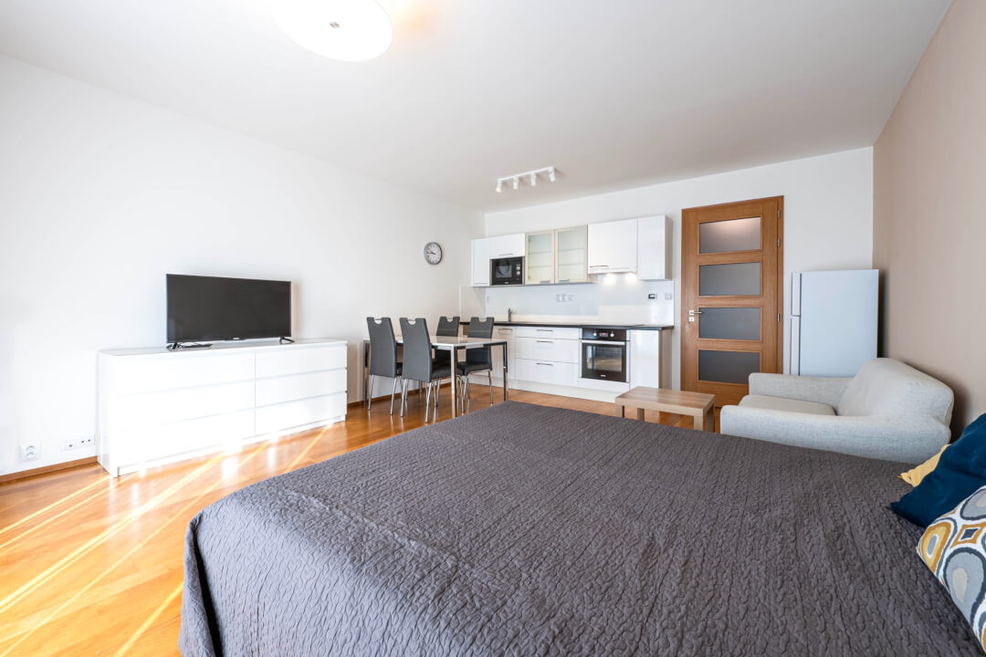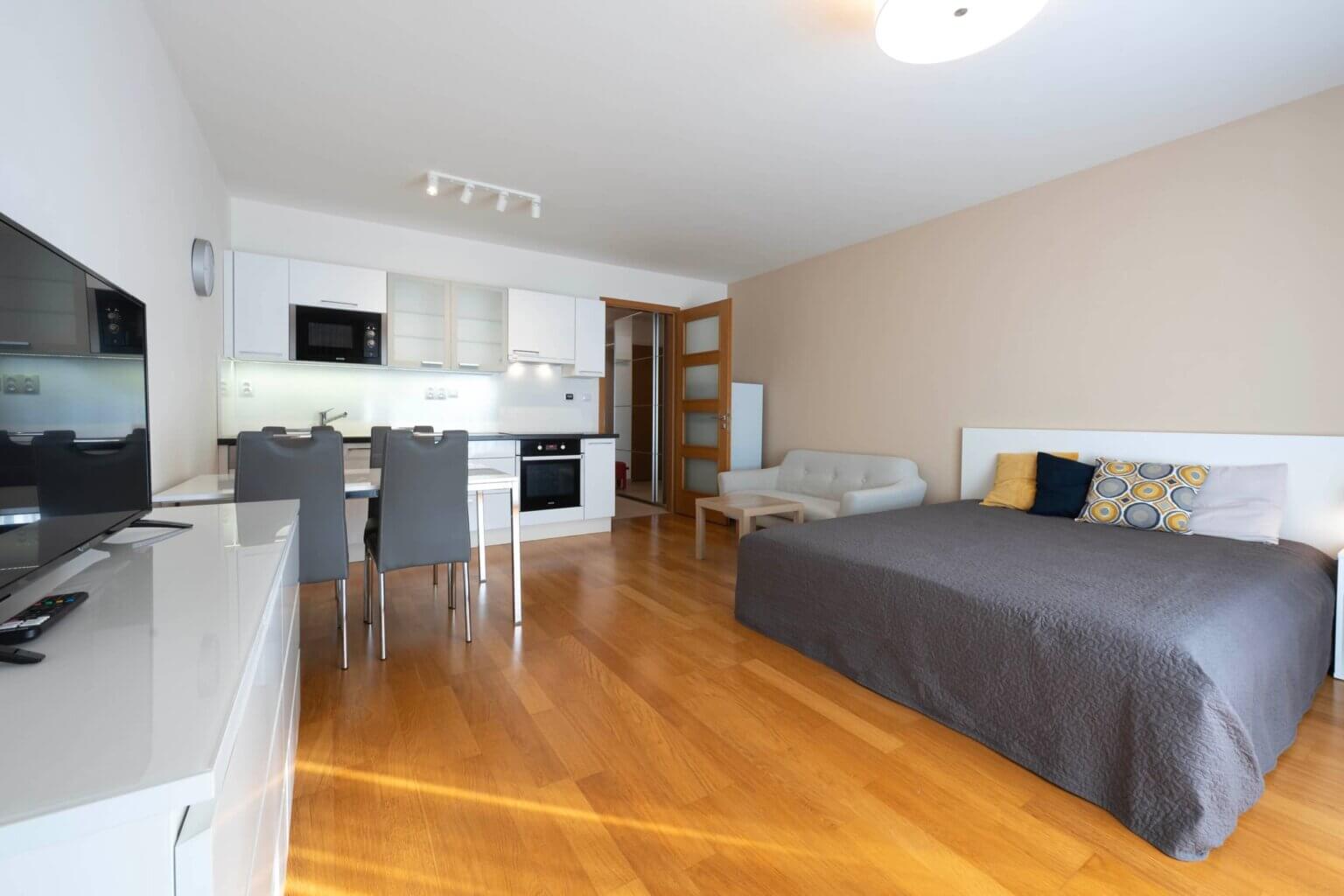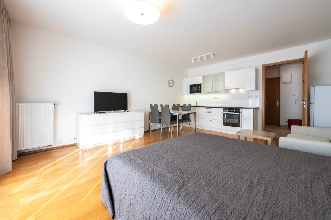 Exkluzivně vám nabízíme krásný a plně zařízený byt 1+kk 36m2 plus balkon 5m2 v 2NP s výtahem v rezidence Jubileum House, ulice Komunardů 20, Praha 7.