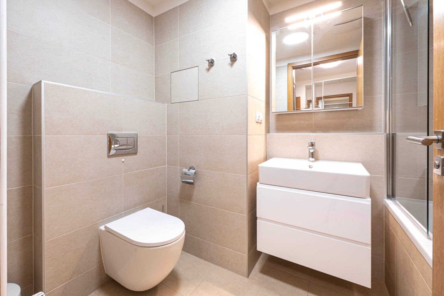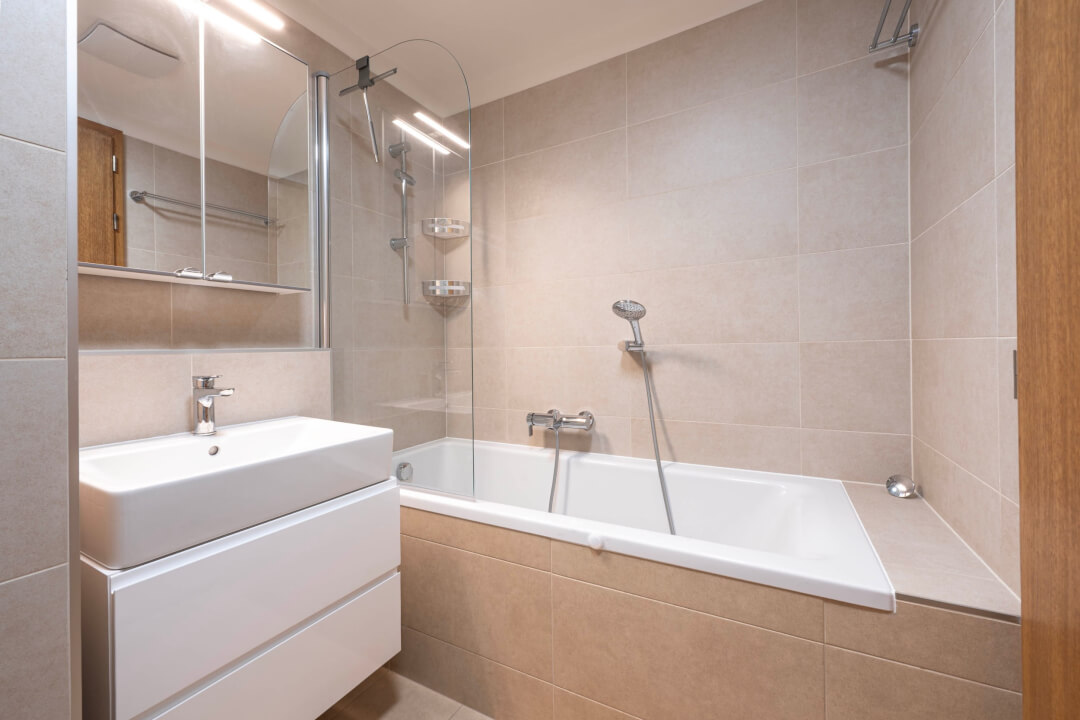 Koupelna je přístupná z chodby a má jak vanu, sprchu, umyvadlo, zrcadlo, úložný prostor.