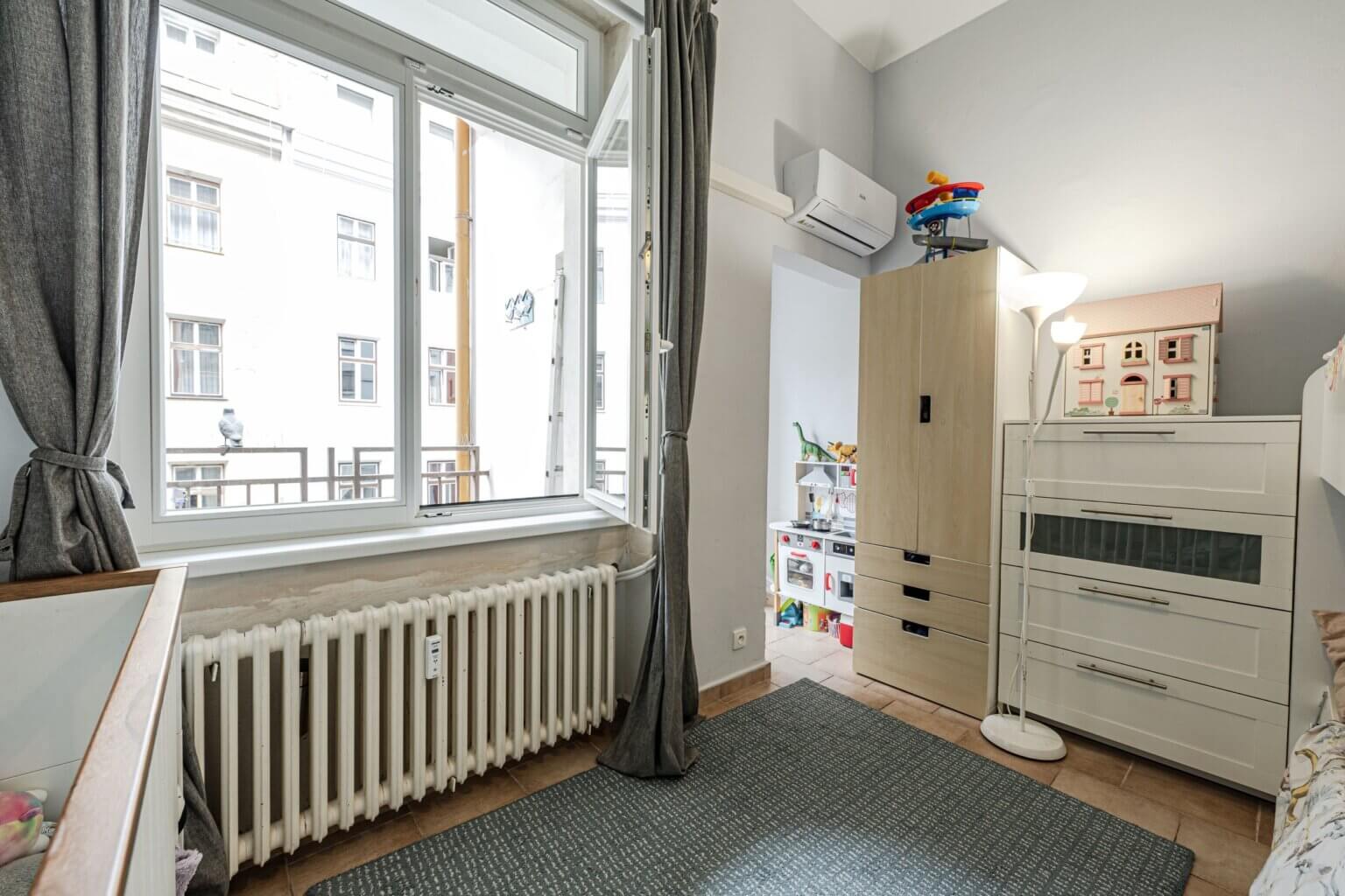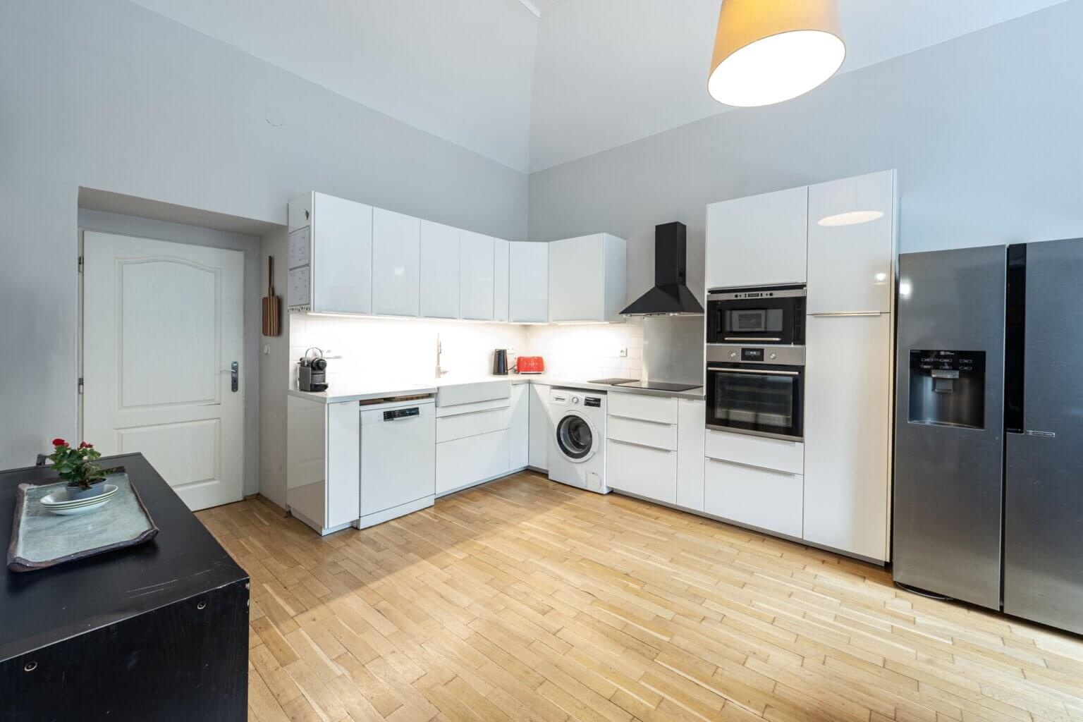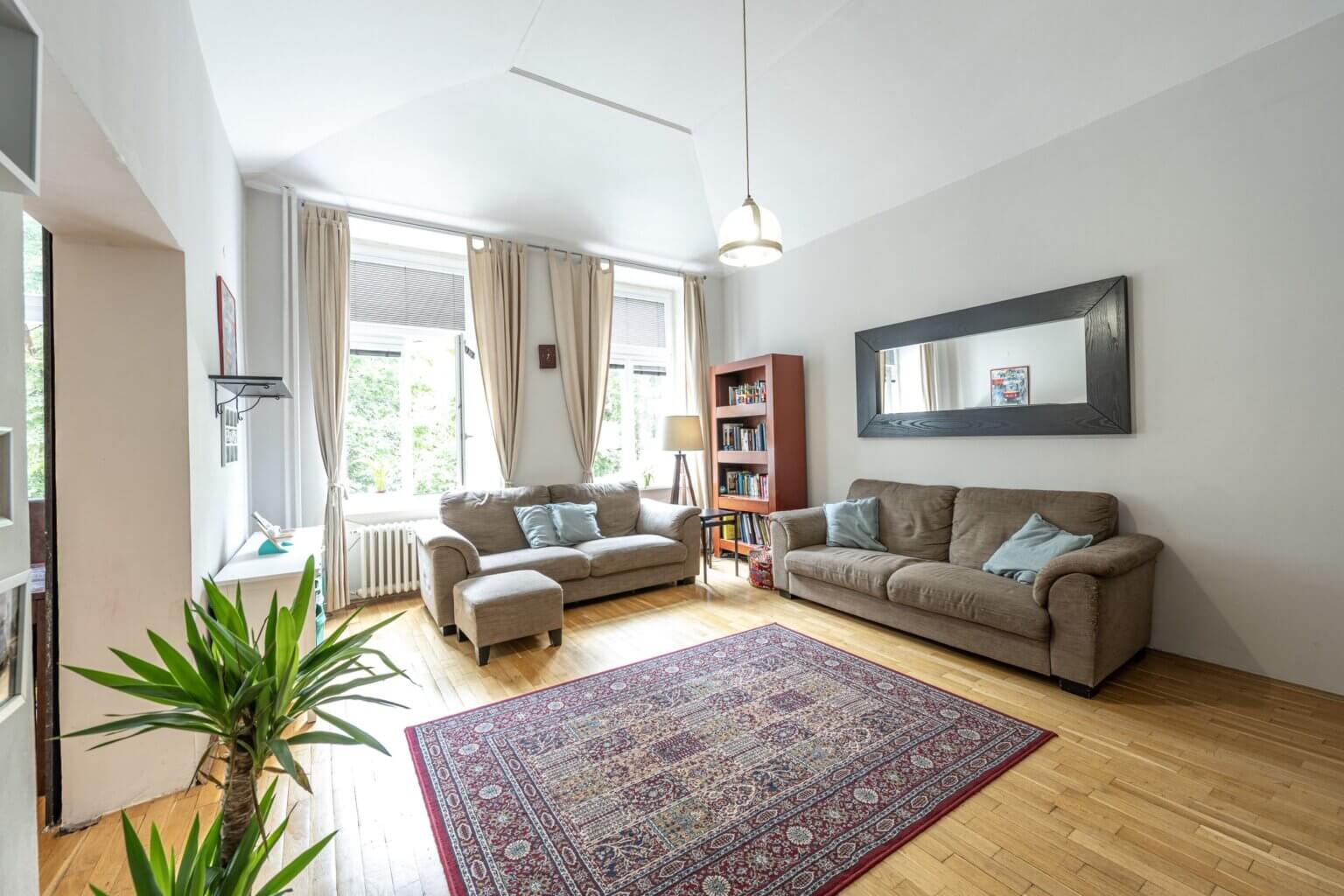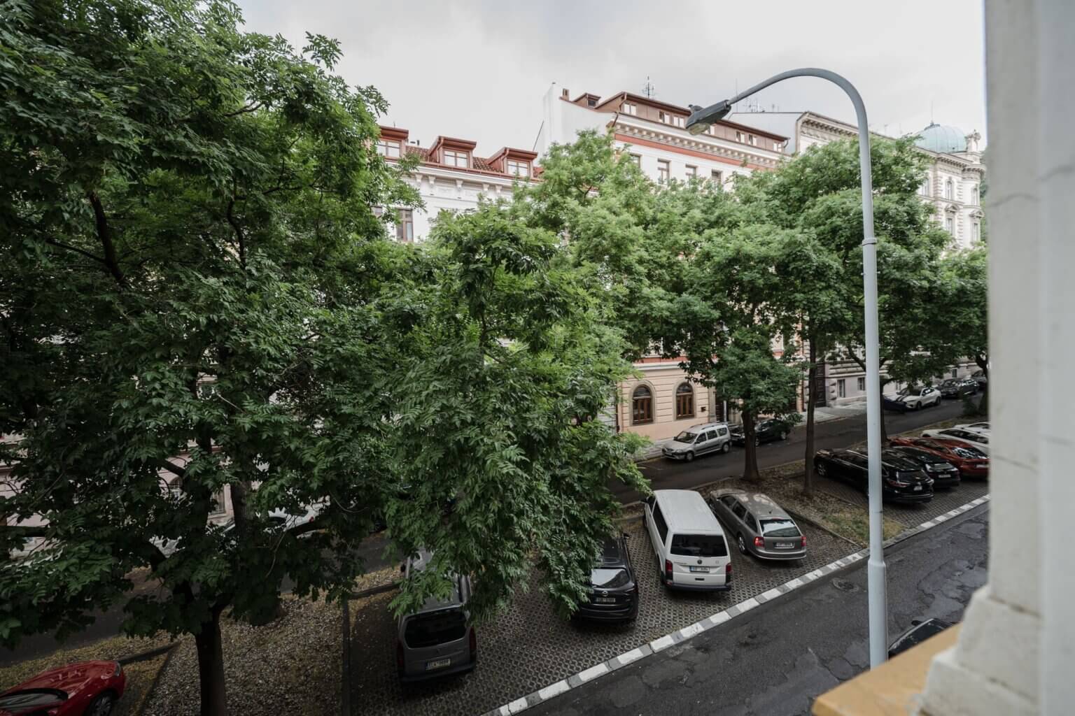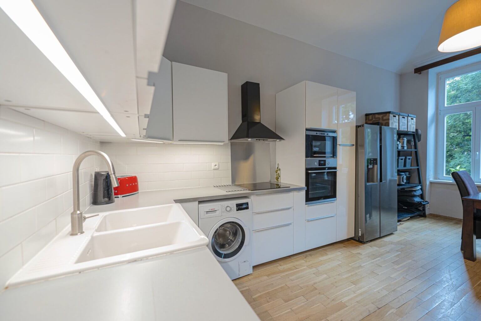 This beautiful apartment with high ceilings was gradually renovated by the owner and offers a spacious living room with a kitchenette equipped with modern Bosch appliances (dishwasher, washing machine), electric oven, induction hob, microwave oven, American fridge with freezer) and a view of both rooms on the trees in Drtinova Street.