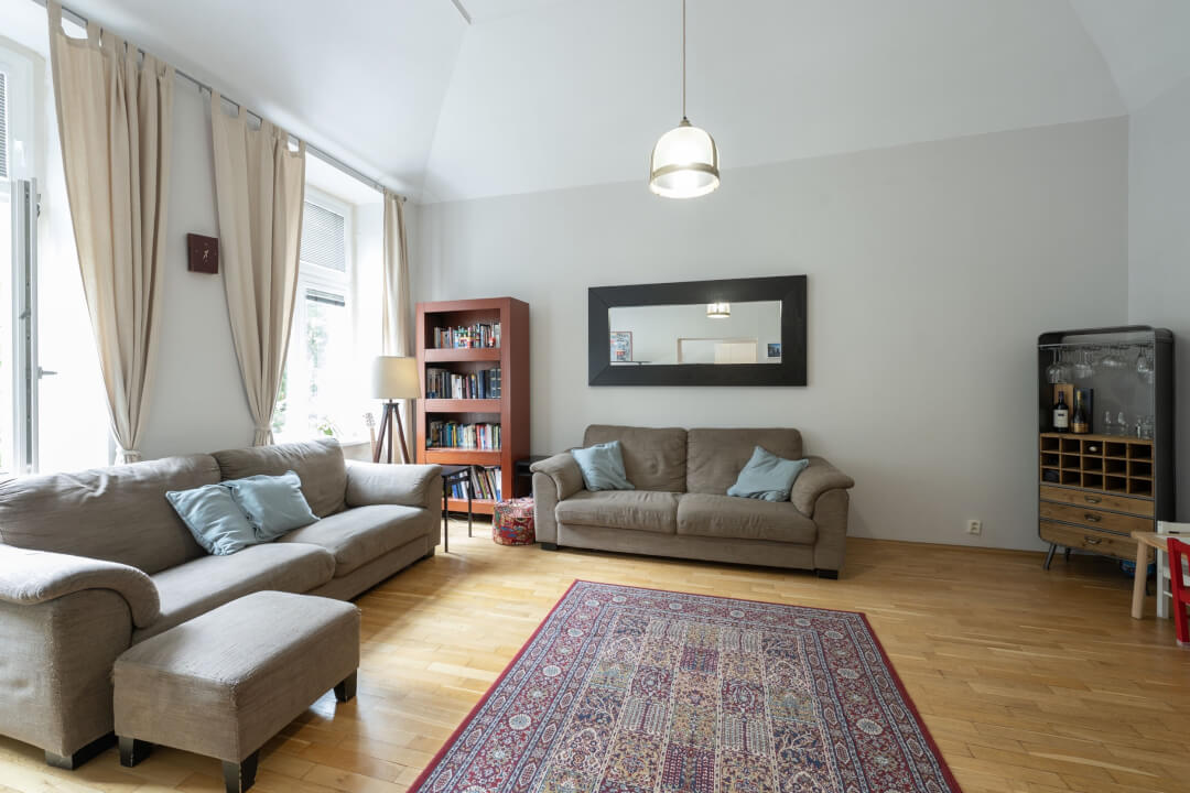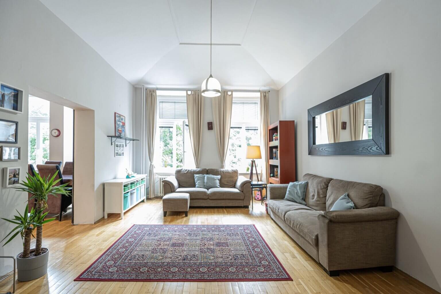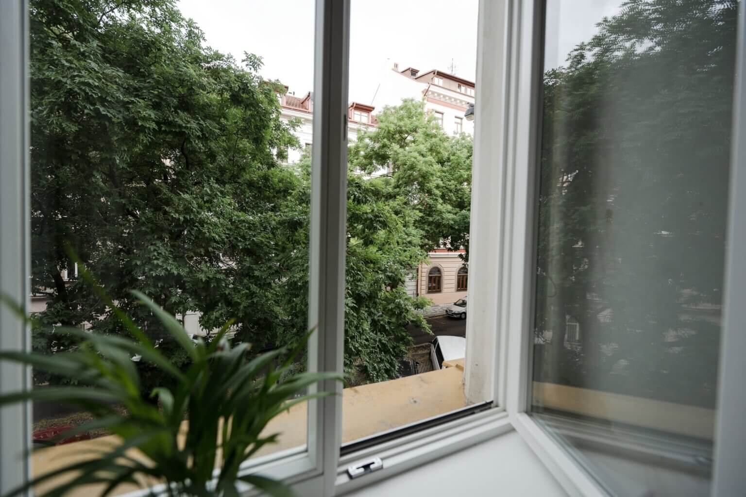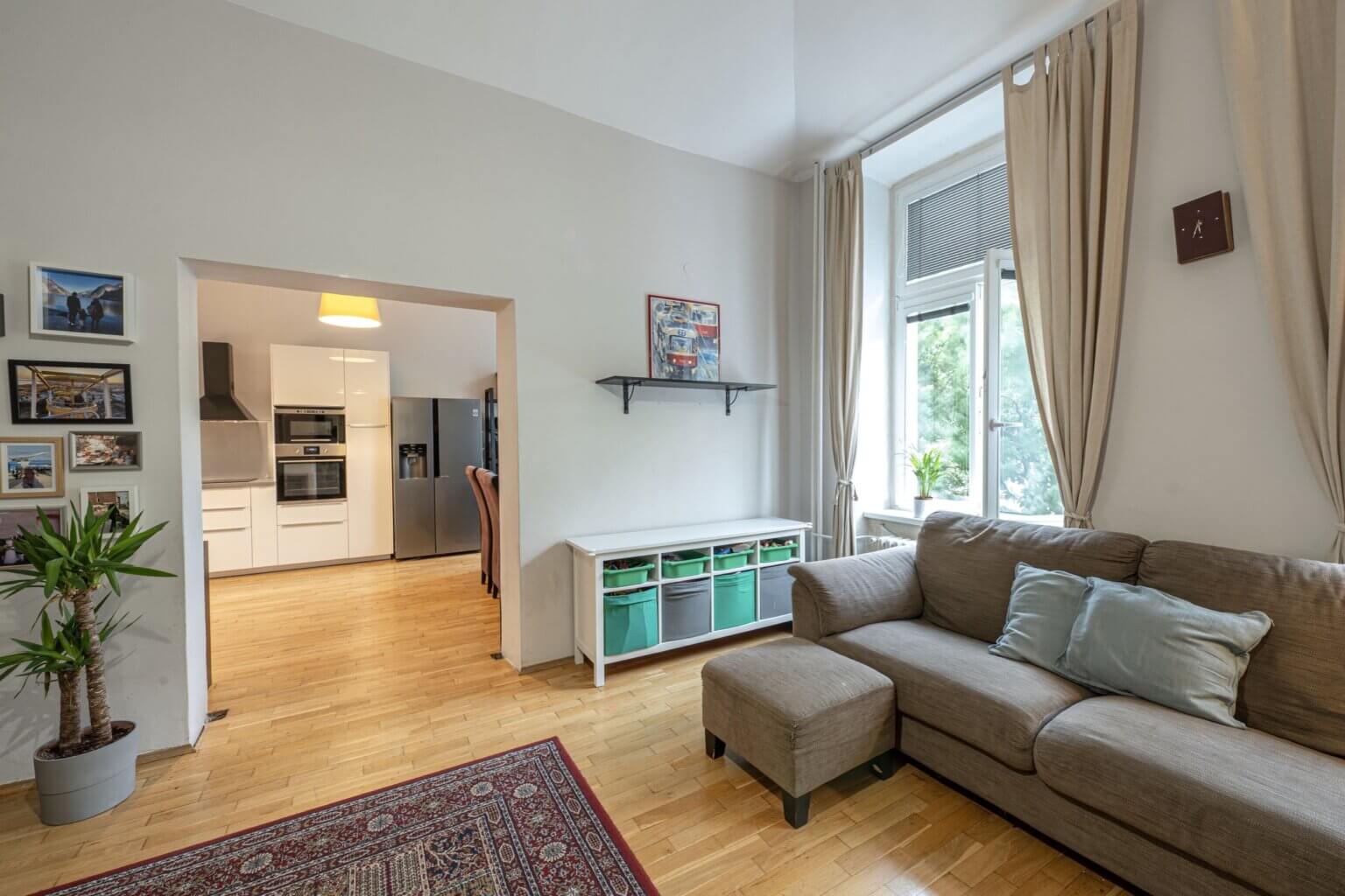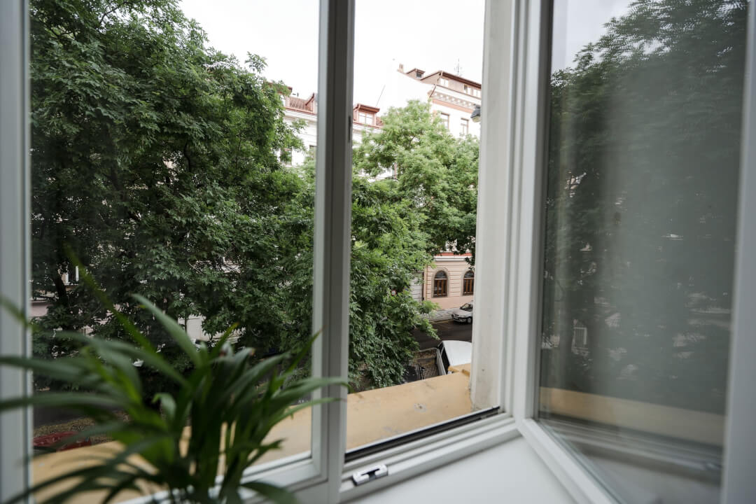 This beautiful apartment with high ceilings was gradually renovated by the owner and offers a spacious living room with a kitchenette equipped with modern Bosch appliances (dishwasher, washing machine), electric oven, induction hob, microwave oven, American fridge with freezer) and a view of both rooms on the trees in Drtinova Street.