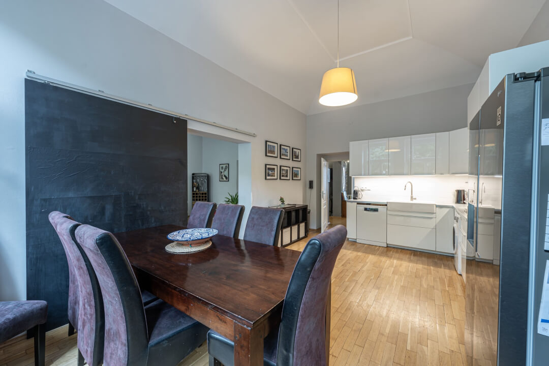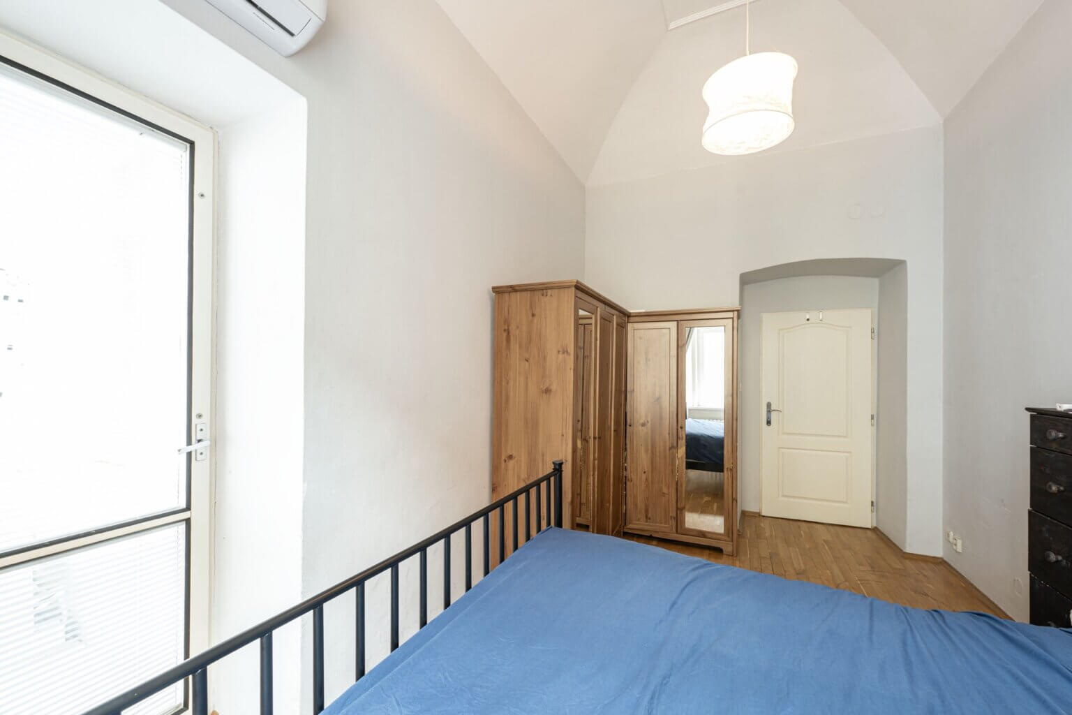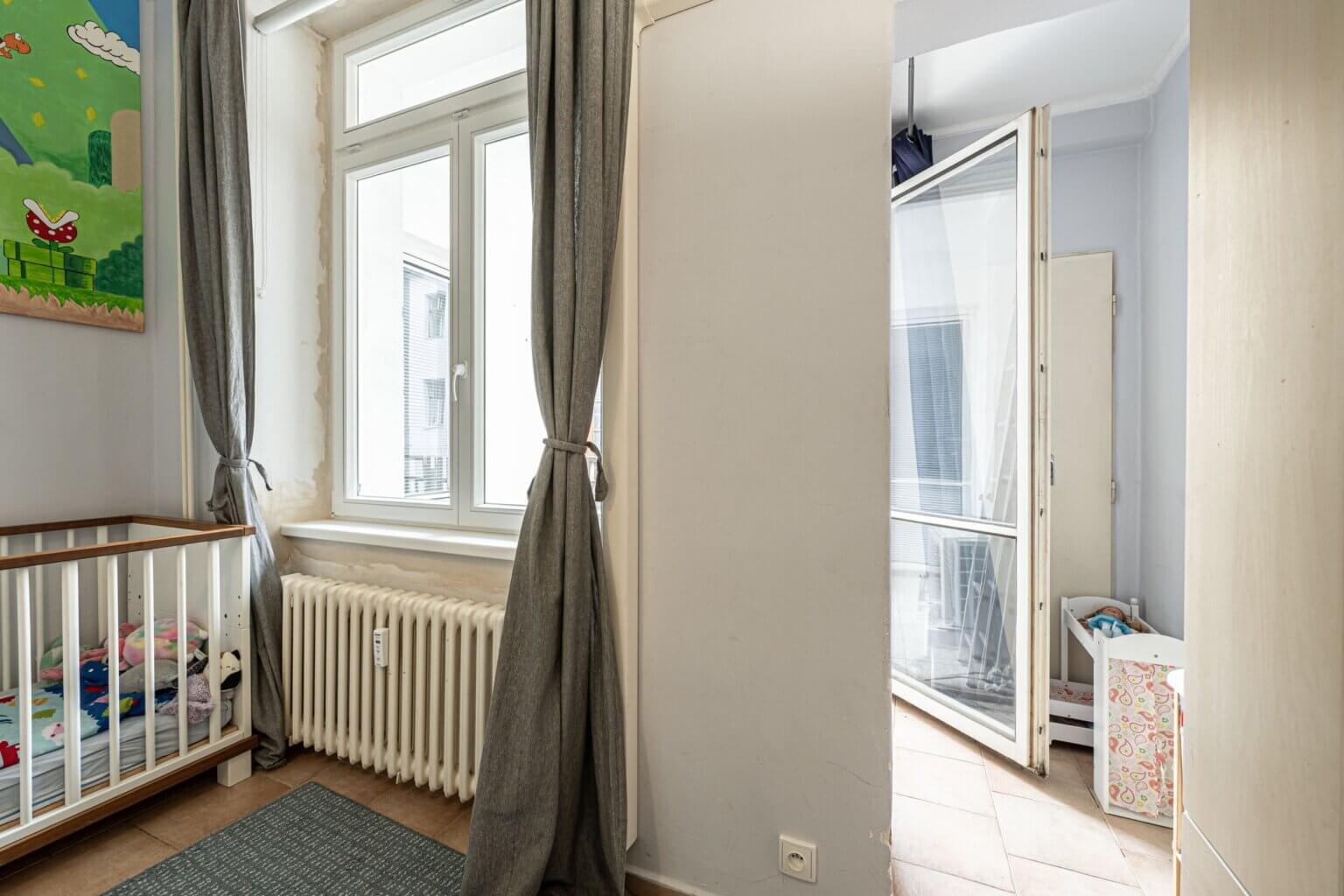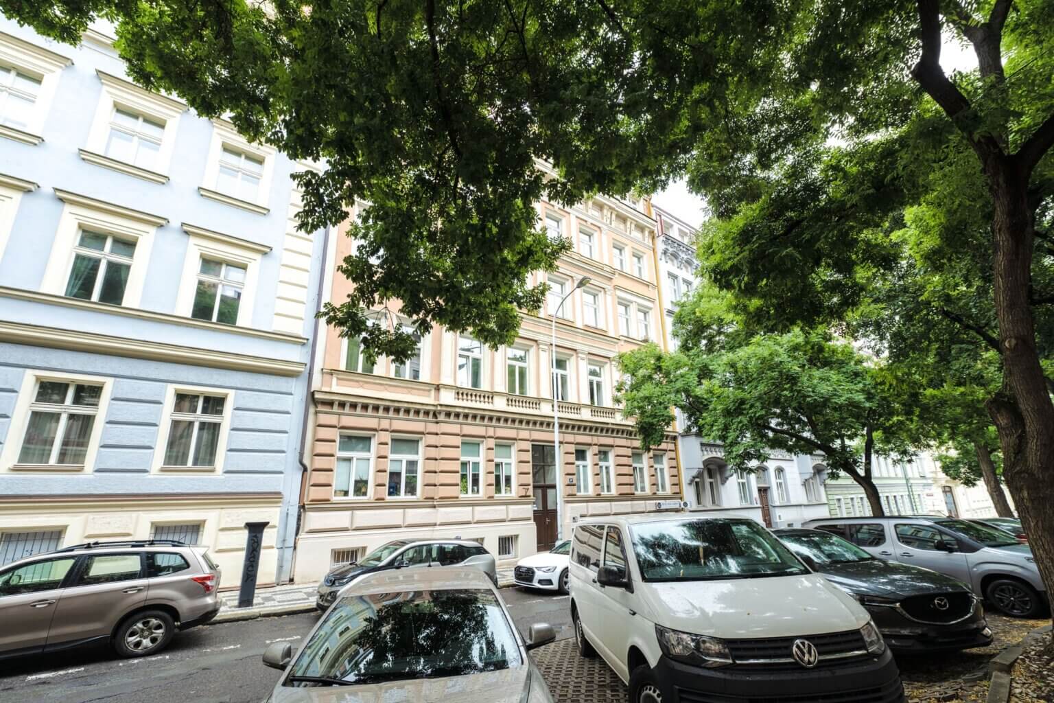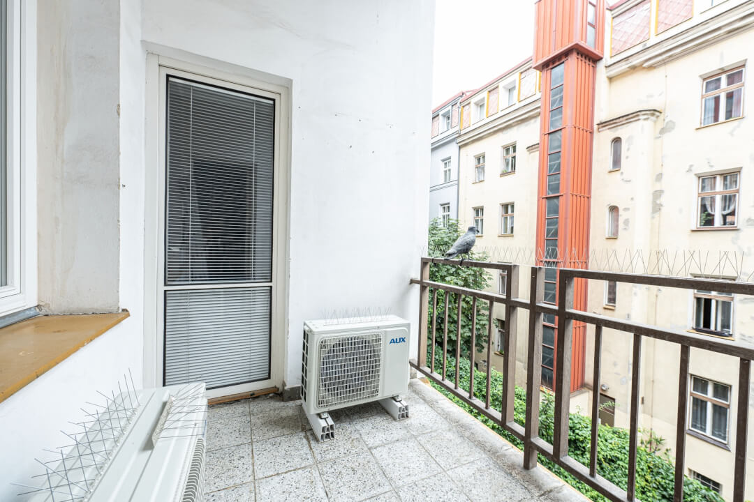 This beautiful apartment with high ceilings was gradually renovated by the owner and offers a spacious living room with a kitchenette equipped with modern Bosch appliances (dishwasher, washing machine), electric oven, induction hob, microwave oven, American fridge with freezer) and a view of both rooms on the trees in Drtinova Street.