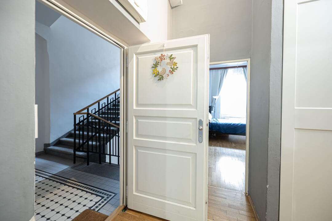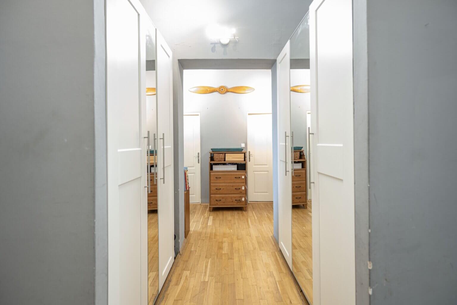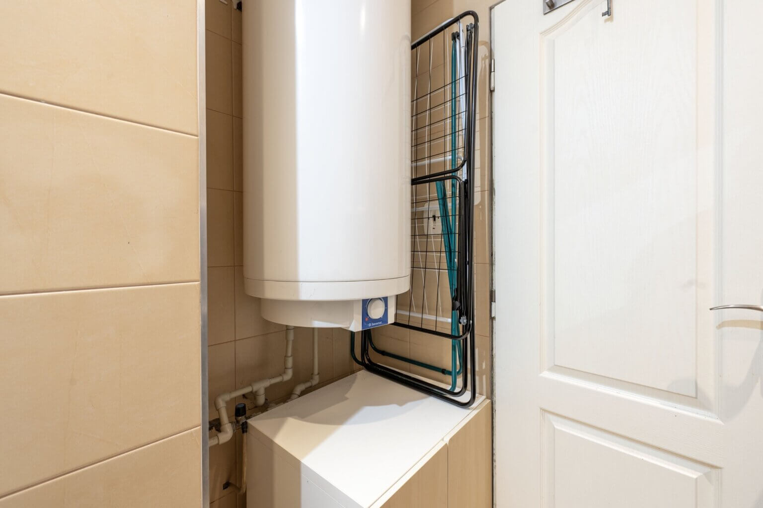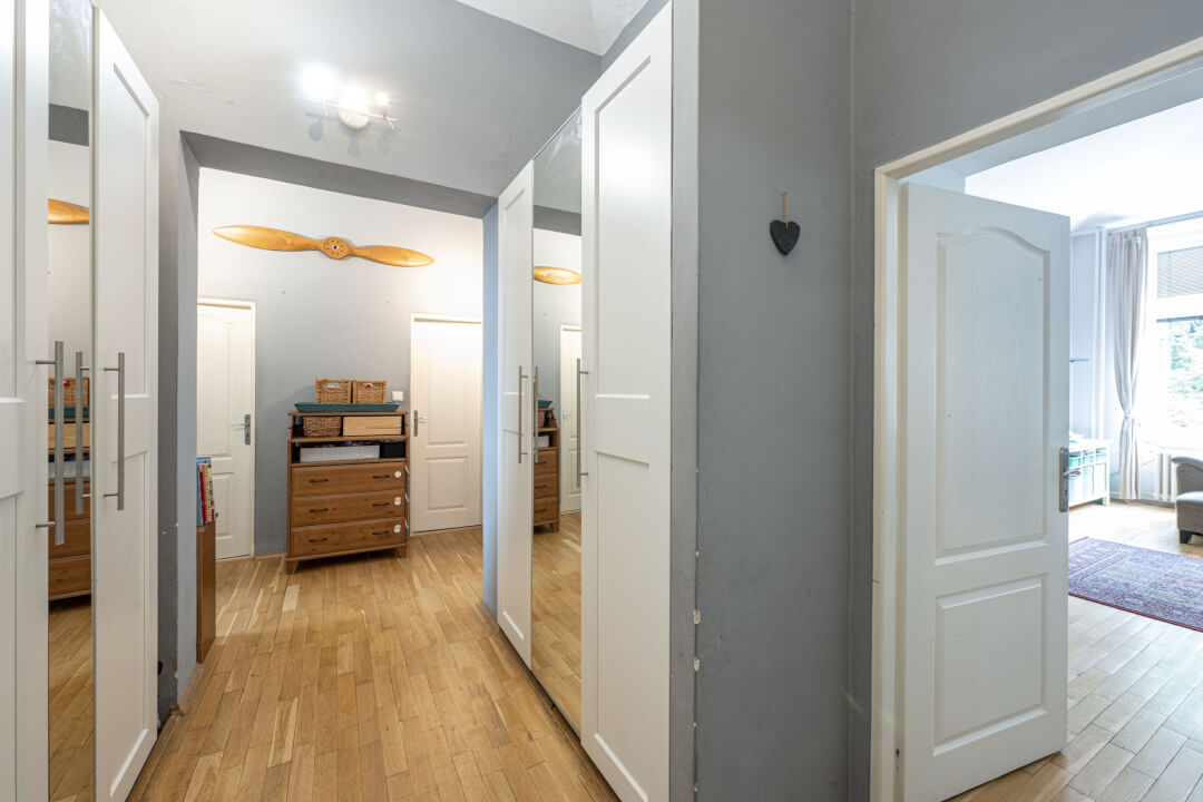 The bathroom has a bathtub, shower screen, sink and boiler. The toilet is separate with a sink. There are storage spaces – closets in the hallway. The apartment also has a cellar.