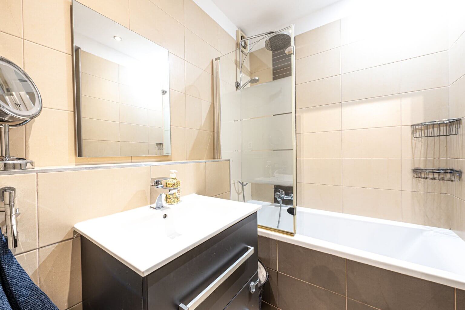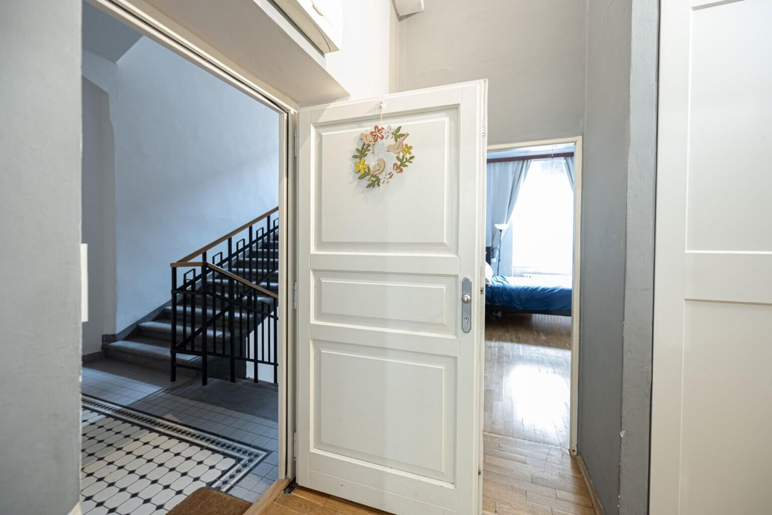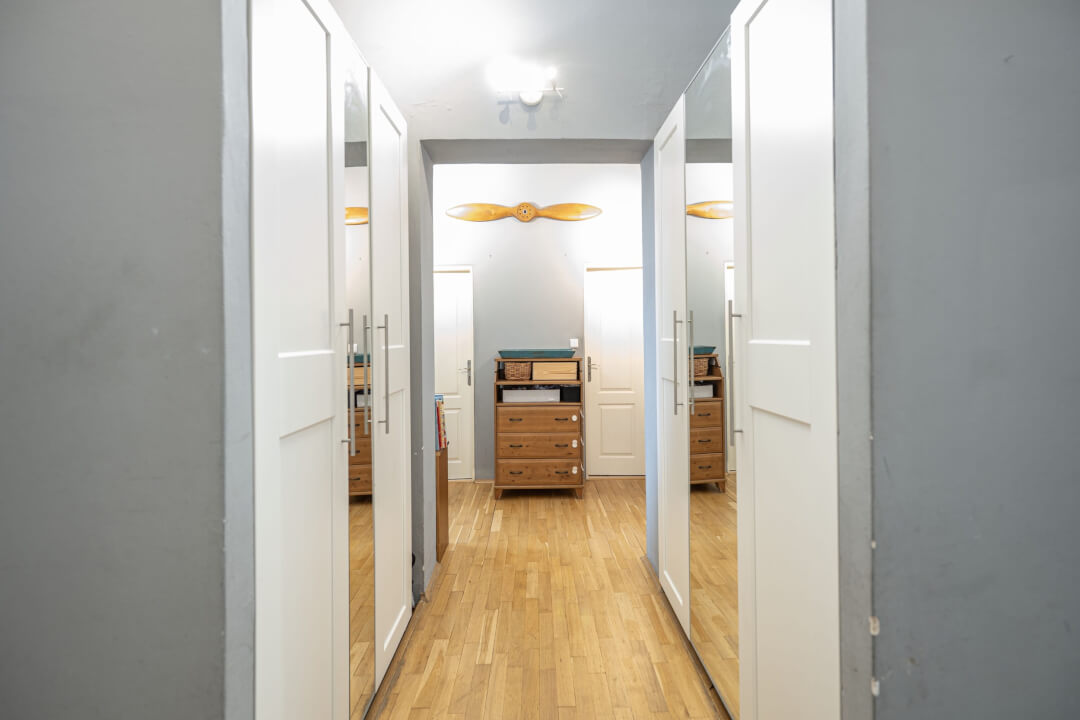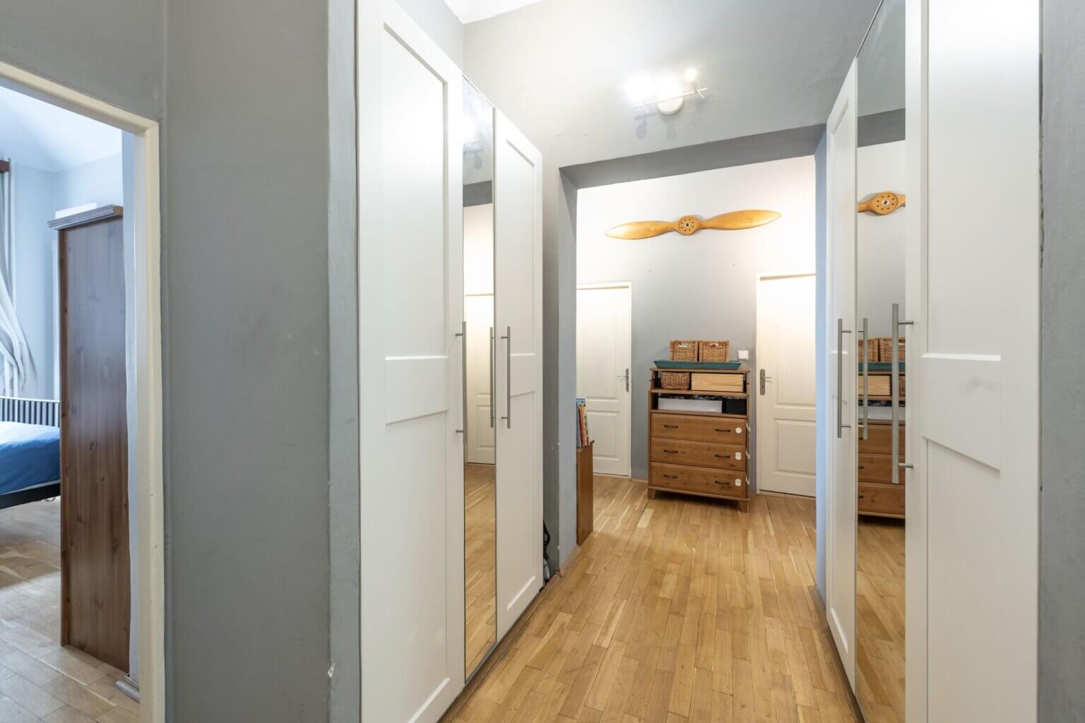 The bathroom has a bathtub, shower screen, sink and boiler. The toilet is separate with a sink. There are storage spaces – closets in the hallway. The apartment also has a cellar.