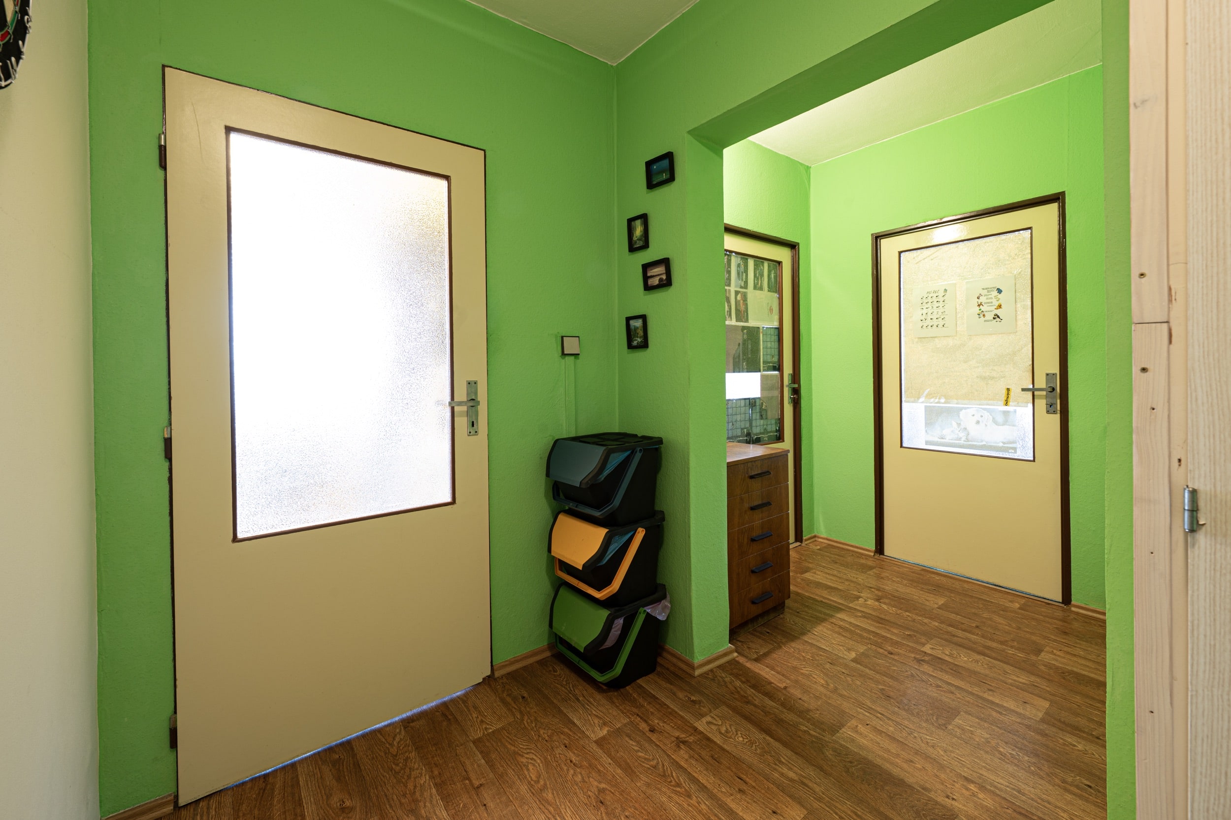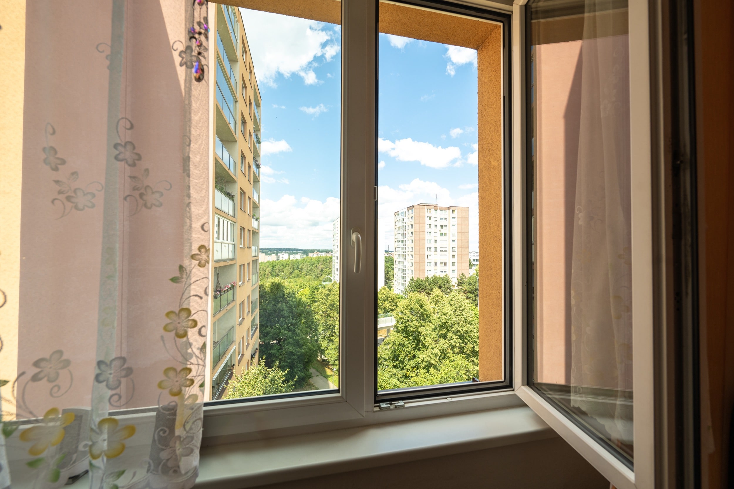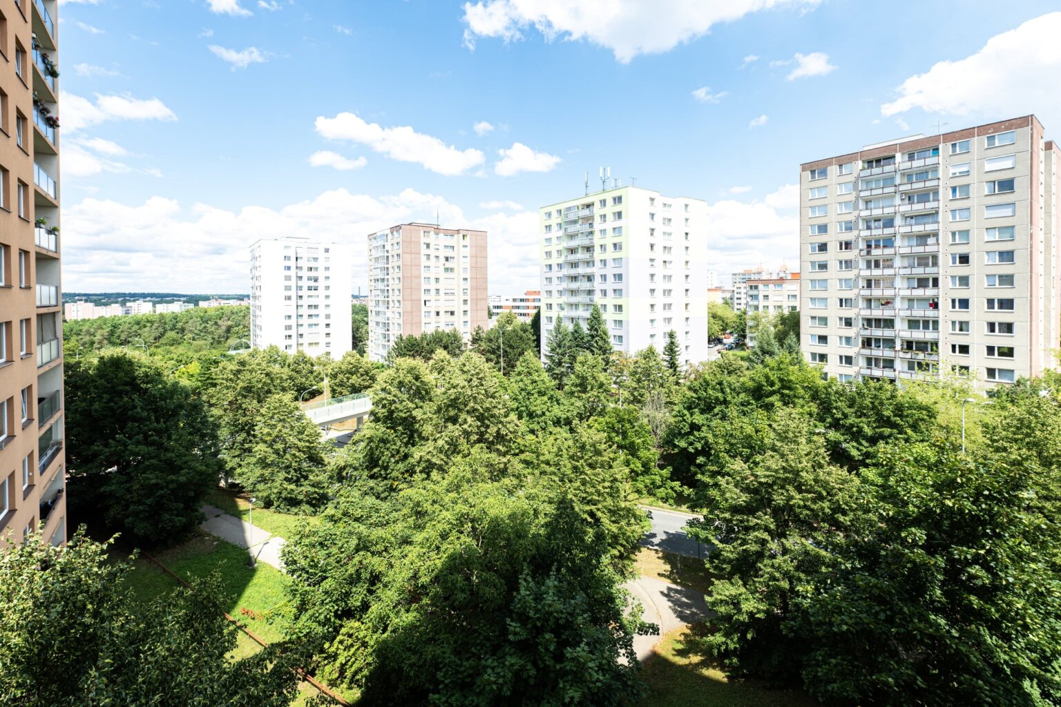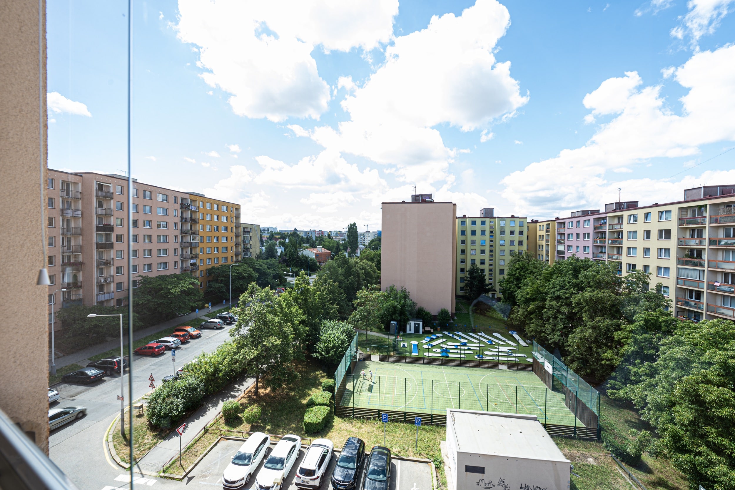 Tento světlý a vzdušný byt nabízí prostornou chodbu 16m2, ze které je vstup do všech místností pokoje jsou tedy neprůchozí. Obývací pokoj 18m2 má vstup na prostornou a zasklenou lodžii s výhledem do zeleně v okolí (včetně posuvných žaluzií na dálkové ovládání), kuchyň 11m2 je plně vybavena moderními spotřebiči (myčka, elektrický sporák a trouba, digestoř) , jak obývací pokoj tak kuchyň jsou orientovány na západ. Hlavní ložnice 13.6m2 a druhý pokoj 12m2 mají severní orientaci. Koupelna 3m2 je s vanou, umyvadlem a pračkou. Toaleta 1m2 je samostatná a je zde komfortní bidetová sprška.